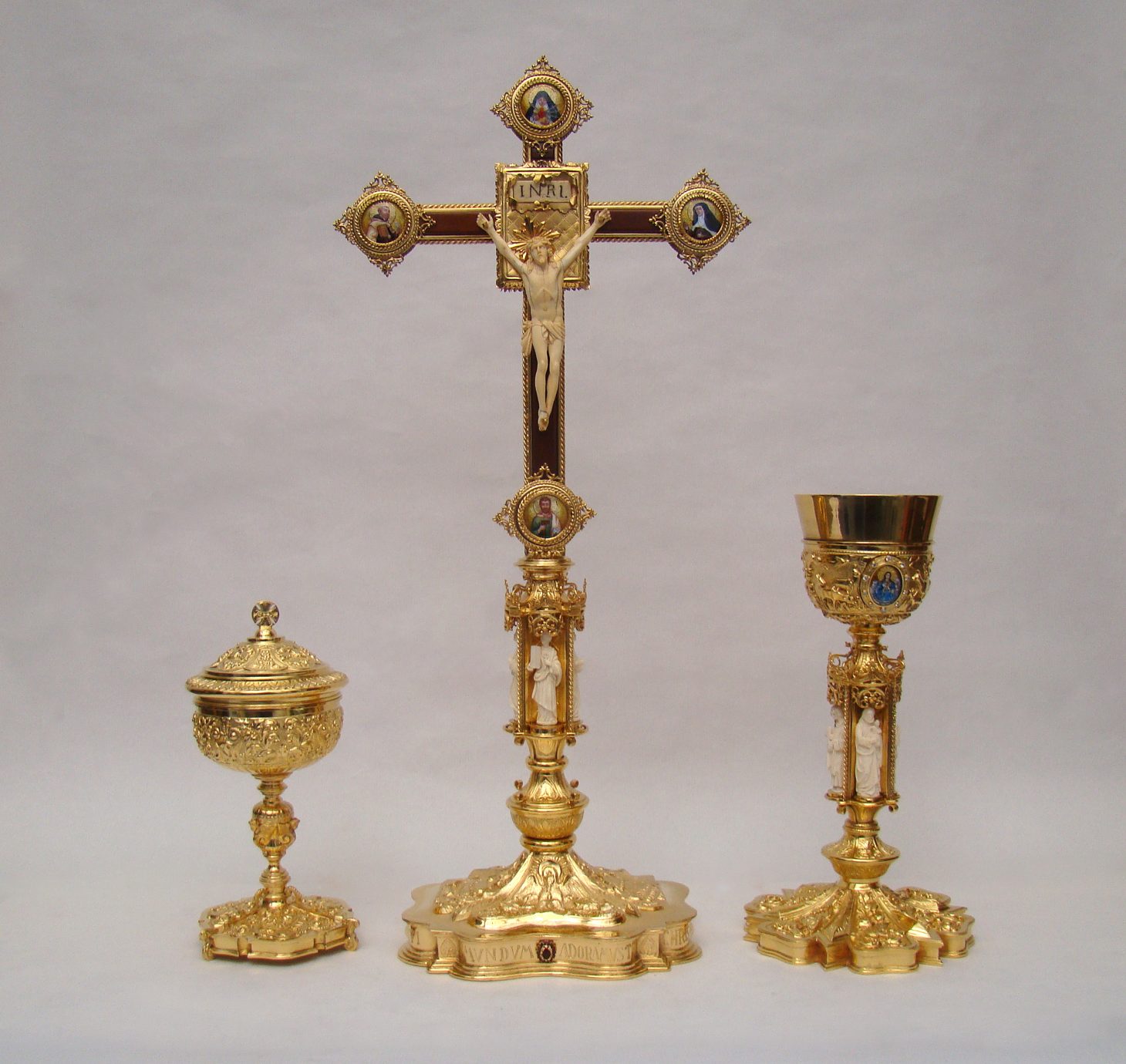Realización de un conjunto de tres botes crismales de plata, ubicados en el interior de una arqueta neogótica de marfil.
