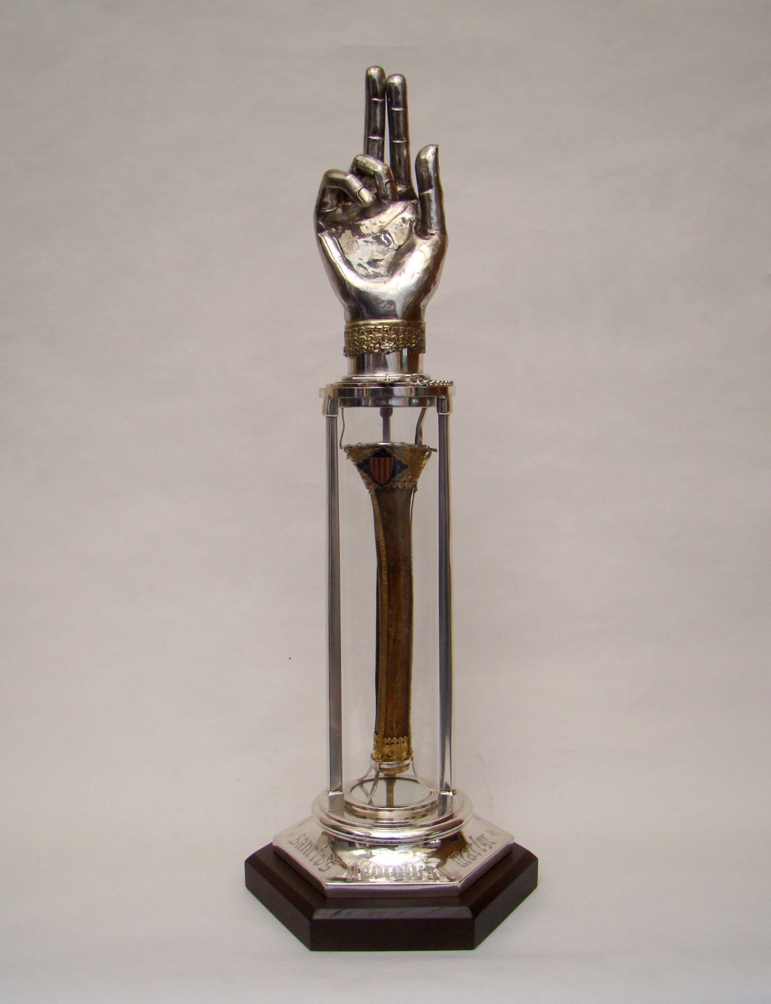 Nuevo relicario que incluye la mano y el hueso original. La mano está articulada mediante una bisagra para poder apreciar el esmalte de San Jorge, y tiene en la base un espejo para poder ver el escudo esmaltado.