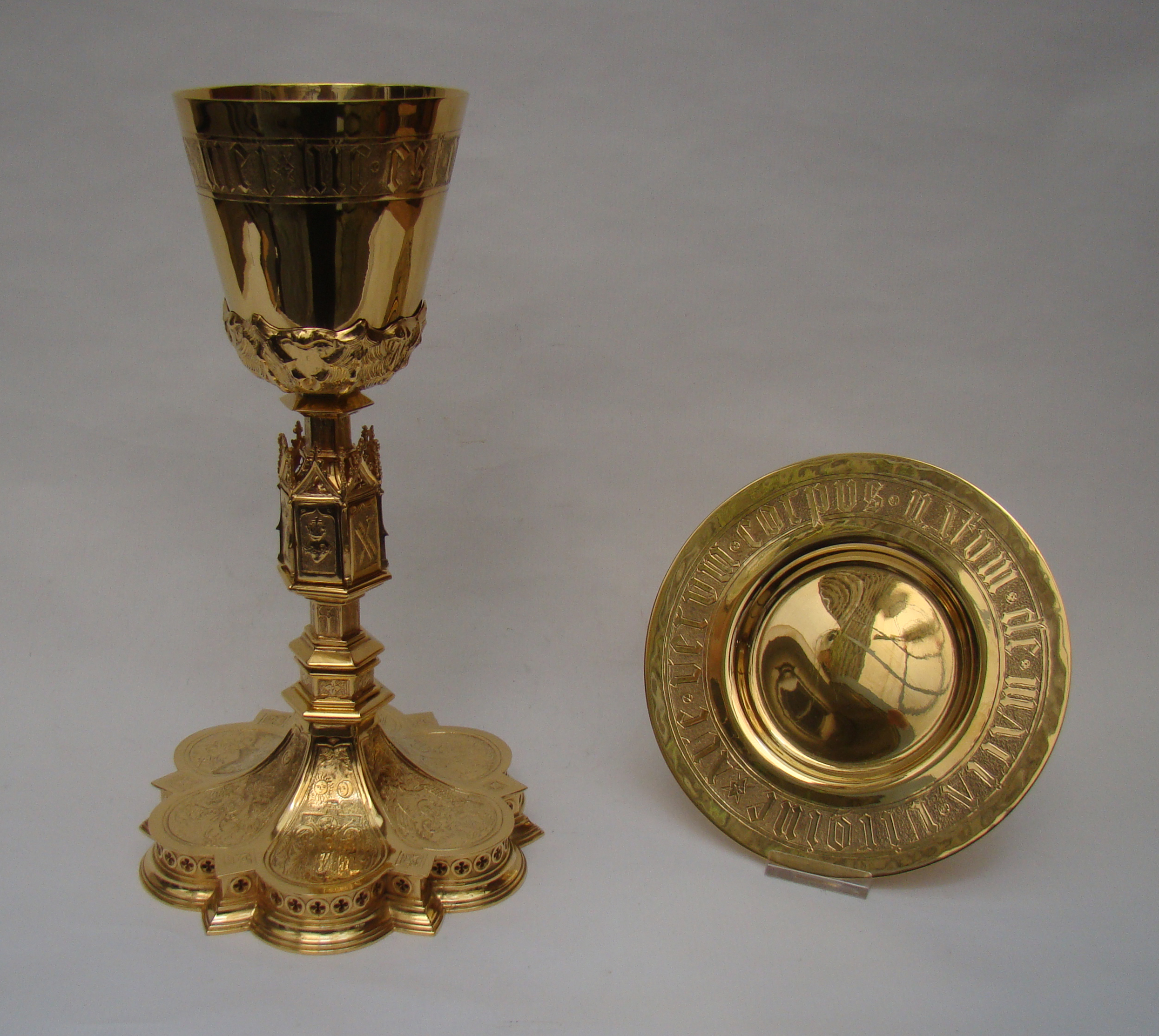 Cáliz siguiento cánones neogoticistas para un seminarista de los Estados Unidos, con iconografía de su propia devoción.