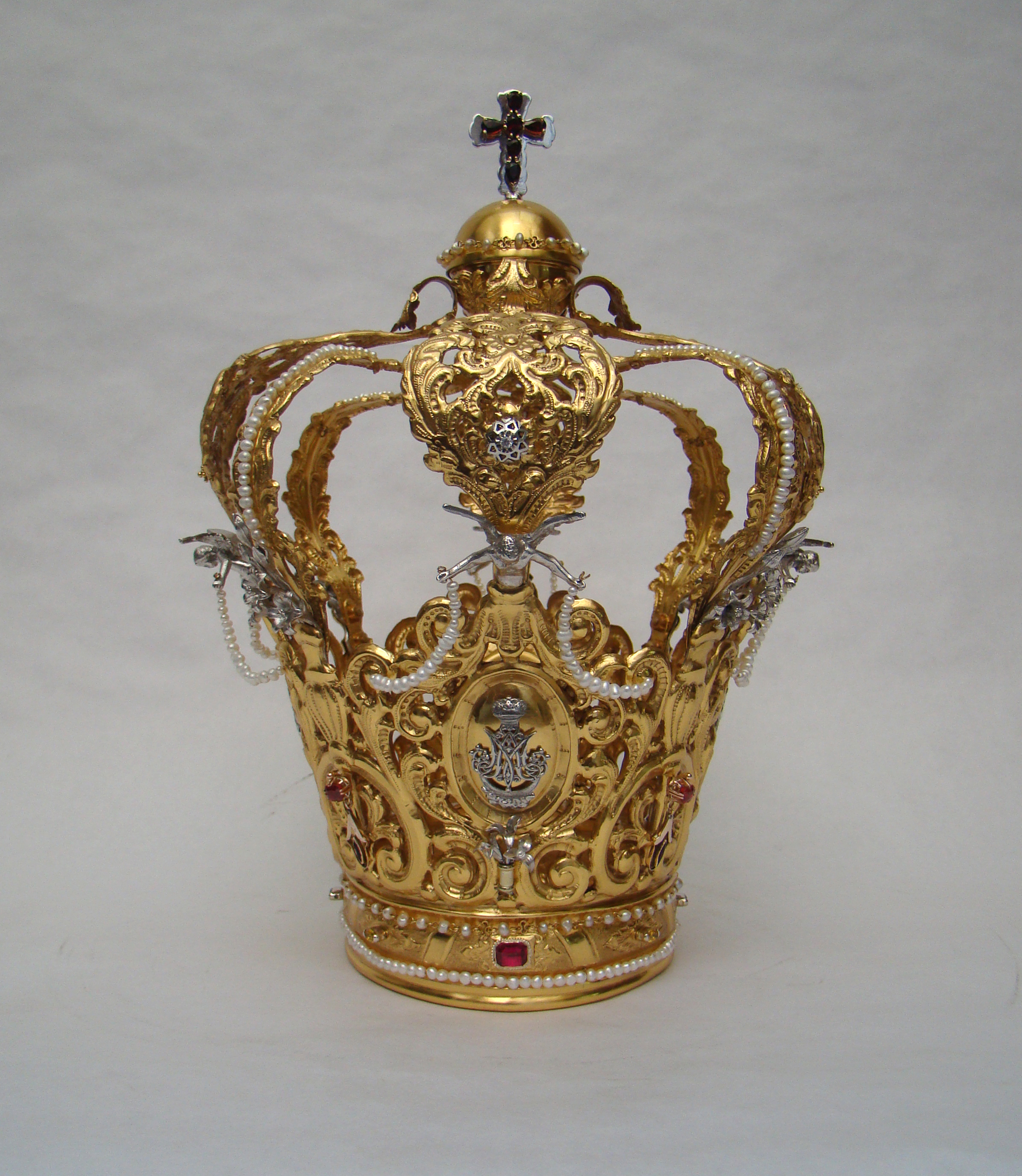 Realización de una nueva corona para la Virgen de las Injurias tras el robo de su anterior corona de diario. Aplicación de joyería proporcionada por la Cofradía, pertenecientes al ajuar de la Virgen.