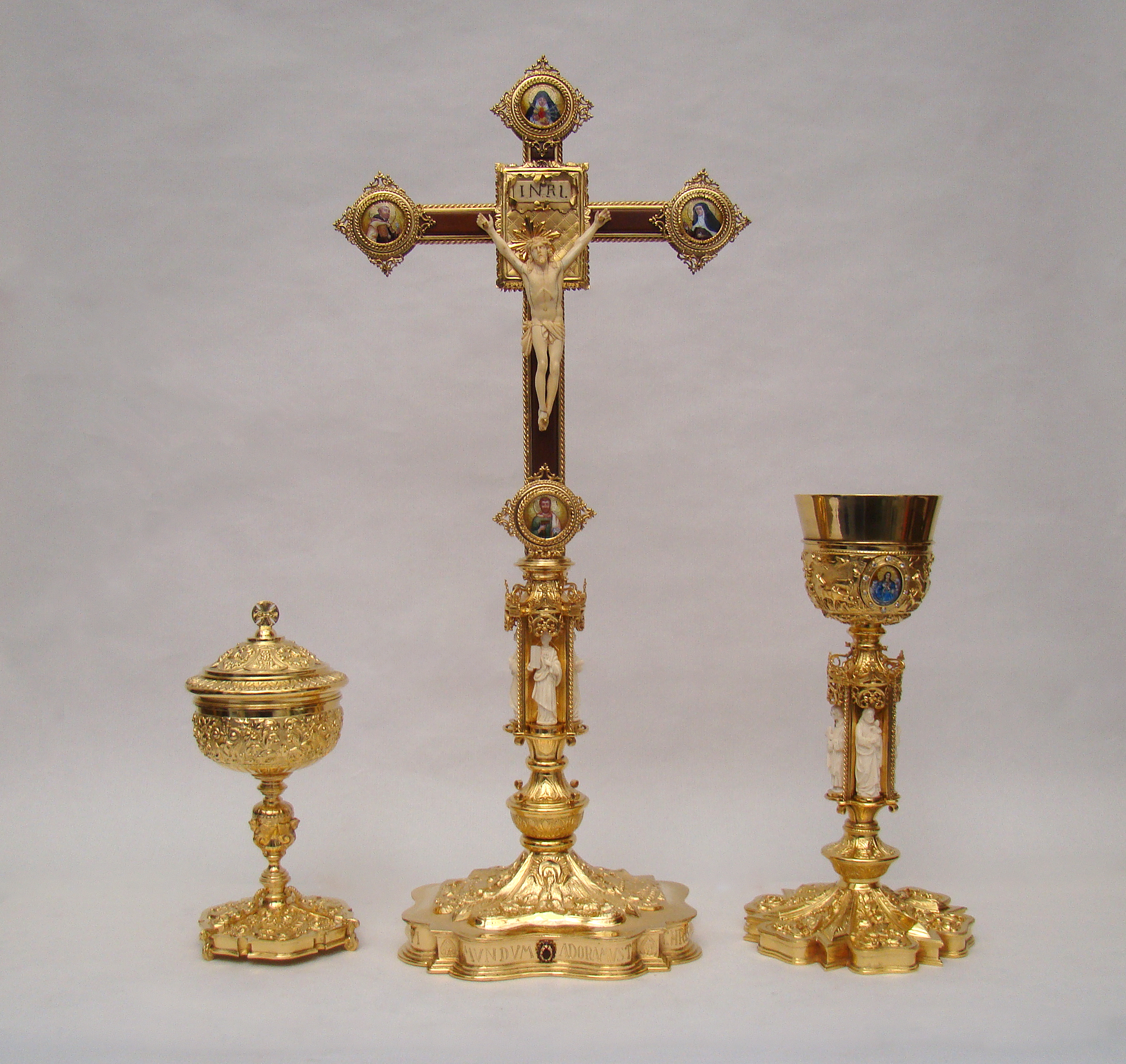 Crucifijo realizado a juego de cáliz y copón de Granda, con un cristo de marfil aportado por el cliente, y en el reverso, un Lignum Crucis.