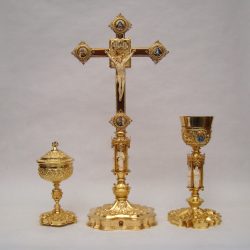 Restauración de una cruz renacentista -solo la cruz- alterada para colgar de la pared durante mucho tiempo. Se elminaron soldaduras de estaño y la anilla trasera. Se realizó una macolla y fuste en estilo para convertirla en procesional.