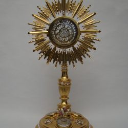 Restauración de la custodia custodiada en la Casa-Museo de los Orduña en el Castell de Guadalest, y perteneciente a la Iglesia de la Asunción. El pie de la custodia se había partido a causa de una intervención con soldaduras de estaño. Se procedió a la eliminación de esta inadecuada intervención, la recuperación del volumen de la pieza rota, y la creación de una estructura del pie para que el peso de la custodia descanse en esta estructura y no en la chapa exterior. Así mismo, se consolidó la sujeción del resplandor superior mediante nuevas piezas interiores, se intervinieron las diferentes sujeciones, roscas y demás elementos de sujeción -replicando las antiguas roscas de plata-. Se aplicó baño de oro y protección.